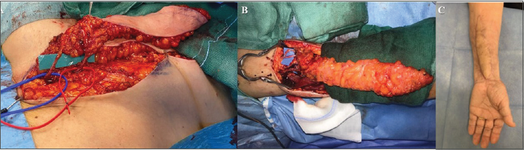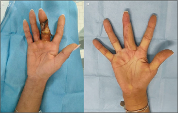 A 35-year-old woman came with necrosis of the radial side of the third finger of the dominant hand (Fig. 2A). Surgical debridement was initially performed in the outpatient clinic, followed by debridement in the operating room after 4 weeks due to extent of necrosis. Antibiotic therapy was started on infectious disease counseling for 3 weeks, after which further surgical debridement and free Proximal Ulnal Perforator flap (PUPF) coverage was performed 20.