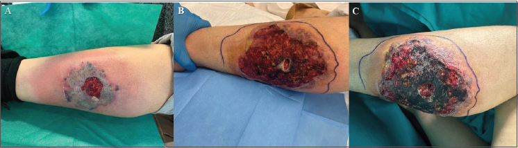 Figure 5. A) ulcer and red, white and blue sign; B) evolution of necrosis; C) antibrachial fascitis.
