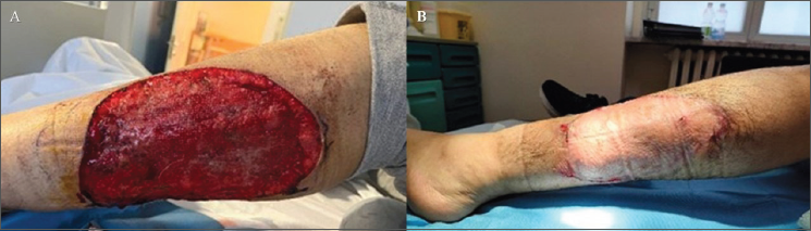 Figure 4. A) wound bed after 20 days of NPWT; B) skin graft without necrotic complications.