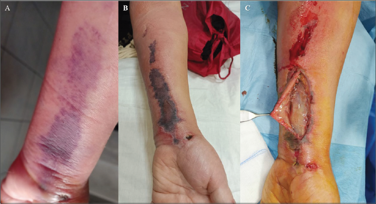 A 59-year-old woman declared the development of ulcers at the volar surface of the radiocarpal joint, initially painless; three days after the suspected bite, a painful bluish-red erythema developed on the forearm. She came to the hospital five days after the bite with necrotizing fasciitis of the antibrachial fascia (Fig. 5). She showed no systemic symptoms. An emergency fasciotomy and debridement of necrotic tissue was performed.