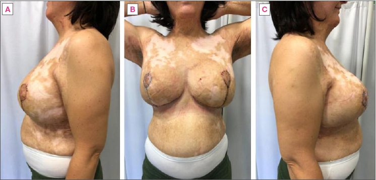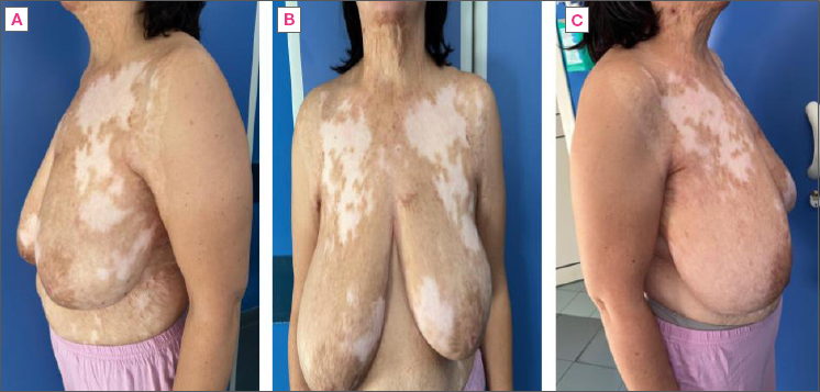 Figure 2. Photographs of the patient during the first postoperative follow-up visit. A) Left lateral view highlighting the restoration of the breast contour with a more natural and harmonious shape; B) Frontal view showing significant breast symmetry and correction of the jugulo-nipple distance; C) Right lateral view illustrating the improvement in breast projection and shape, with reduced scar adhesions and a more uniform appearance of the tissues.