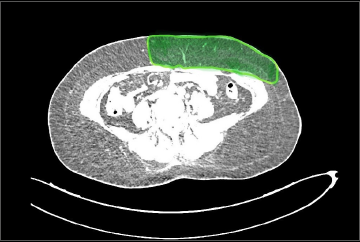 Figure 3. ROI corresponding to the anticipated DIEP flap territory based on perforator location and volume of hemiabdomen calculated.